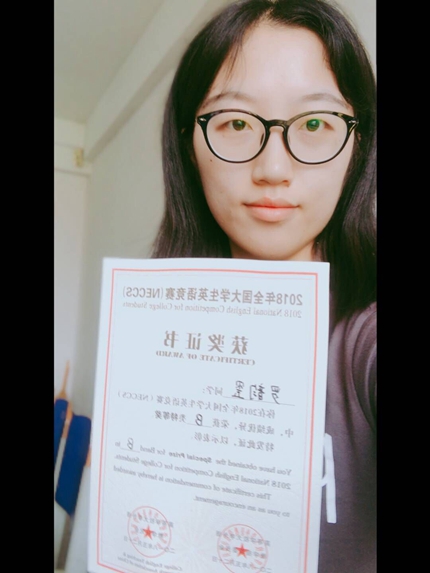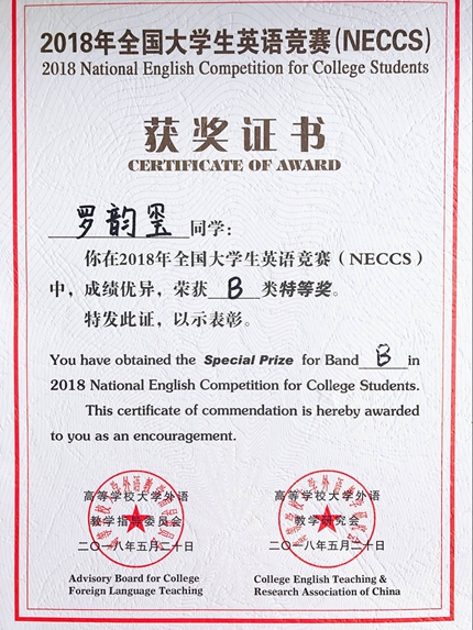 2018年全国大学生英语竞赛辽宁赛区决赛成绩于近日揭晓,我院英语专业1502班罗韵玺同学力压群雄,喜获决赛B类(英语专业)特等奖。